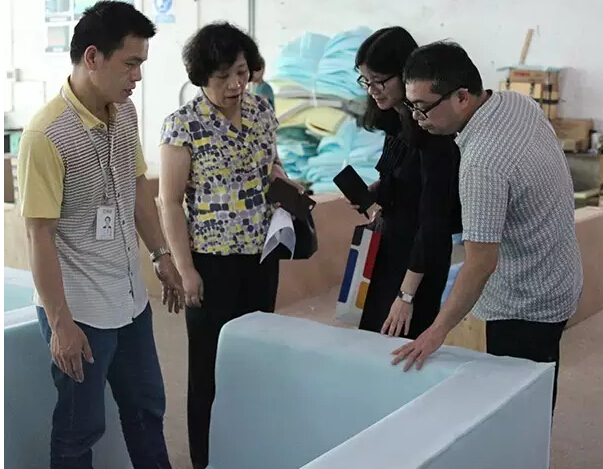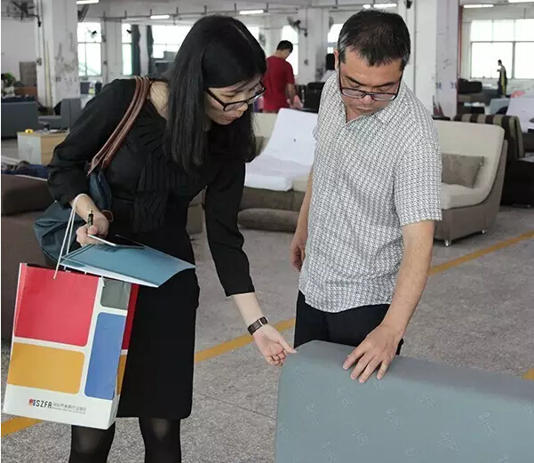 2016年4月27日,深圳市家具行業協會副秘書長、檢測中心負責人劉麗娜女士及一行專業檢測人員前往格調家私進行第三輪抽檢測評工作。期間專家人員深入生產車間實地考察,對系列產品的原材料和成品進行隨機抽檢,工作結束后,評審專家組宣布格調家私第三輪抽檢產品均符合“綠色優品”標準。