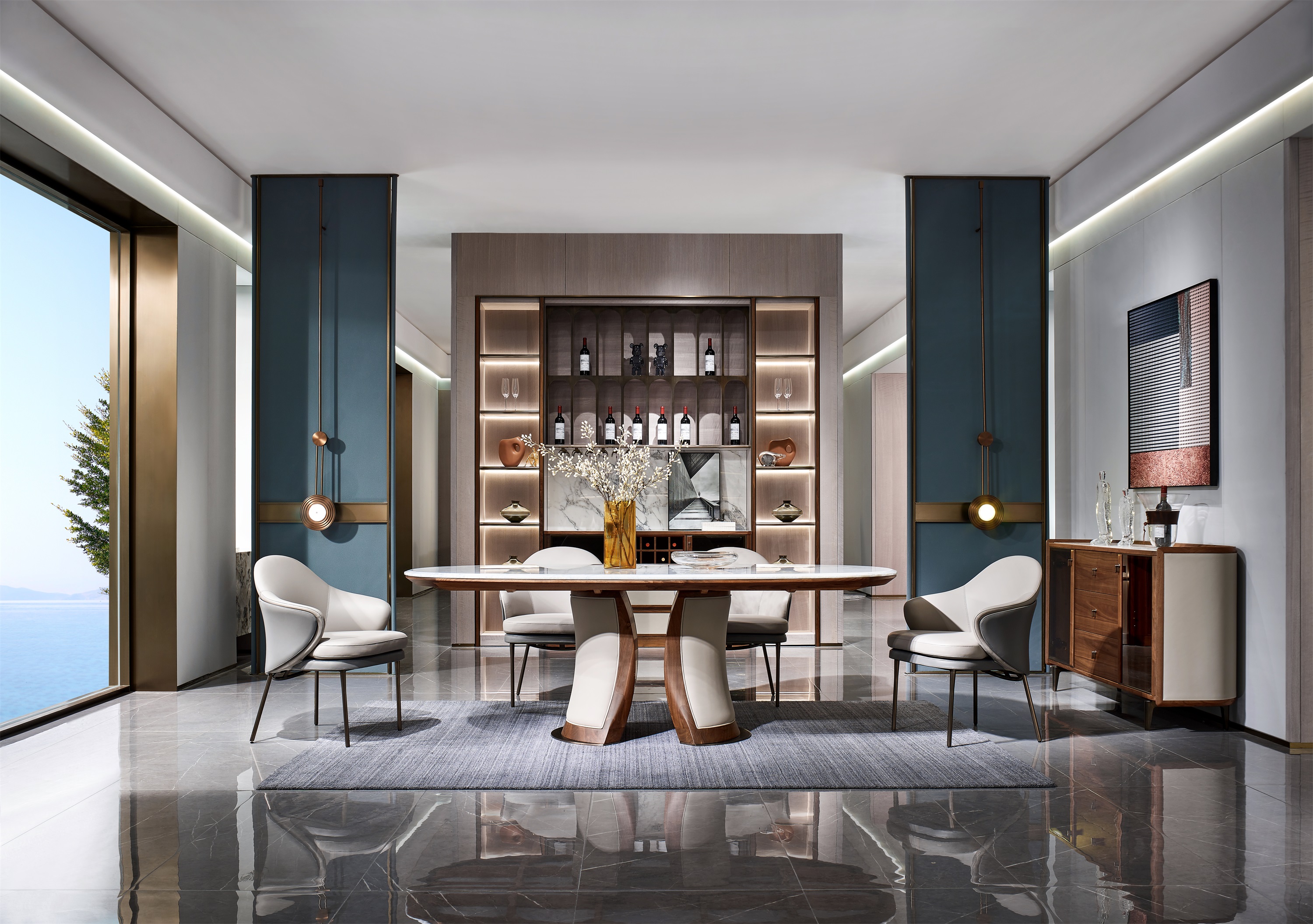 在材質(zhì)上,大膽引入新材料,將胡桃木與真皮、天然大理石、金屬、巖板、玻璃、布藝等巧妙搭配,讓產(chǎn)品在舒適之余更不失時(shí)尚氣質(zhì)。
