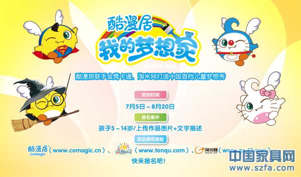 記者了解,目前“我的夢想家”節目正在面向全國6-14歲的孩子以及家庭征集“夢想的家”相片。參與者只需登錄酷漫居官方商城網(http://www.comagic.cn/)、同趣網(www.tonqu.com)、淘米網(www.61.com)的活動報名頁面提交對家的夢想相片。只要報名就有機會獲得迪士尼精彩卡通禮品、迪士尼禮品豆袋沙發、迪士尼魔盒等。上傳作品最高投票者可獲得價值近3000元的兒童高低床。