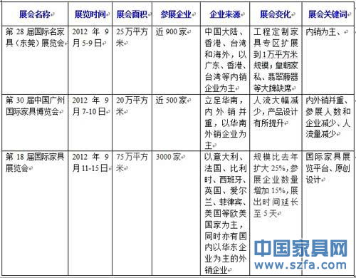 展會作為家具行業對外展示的一個窗口,始終吸引著眾多相關人士的目光。企業重視、參展者關注、媒體聚焦,9月展會月,再次成功吸引了所有的人關注和聚焦。在家具業市場不景氣的2012年,進一步拓展市場渠道成為家具企業的當務之急,那么,扎堆的展會到底能給家具企業帶來哪些受益?又能讓持續虧損的家具經銷商看到什么希望之光?面對市場之變,家具展會又做出了哪些適時的調整?通過9月三大家具展會的對比,為您一一分析。