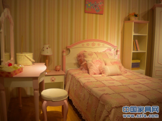 整個房間裝修和飾品以粉色系為主,配以暖色燈光。床品的粉色蕾絲花邊與梳妝臺和床頭的造型相呼應。讓人不禁聯想到房間的主人一定是一位甜美可人的小公主。