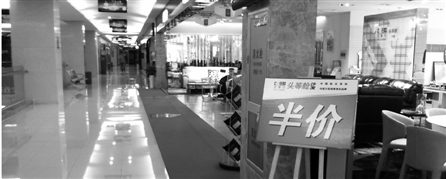 昨天上午,陰雨綿綿。雖然沒有像傳言那樣停電停空調(diào),歐亞達(dá)濱江店仍然照常經(jīng)營,但人氣跌到了谷底。記者視線范圍內(nèi)營業(yè)員比顧客要多得多,差不多三分之一的店面處于關(guān)門或半歇業(yè)的狀態(tài),堅持營業(yè)的也都在門口豎起牌子——雙休特惠,或干脆“半價”。