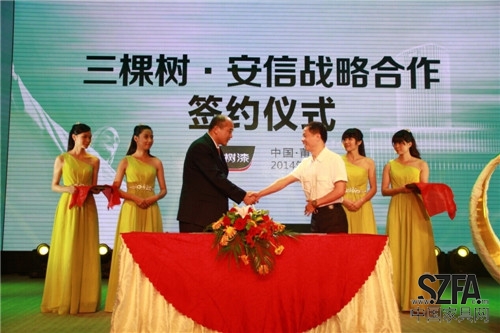 2014年7月24日16點,“引領•顛覆”三棵樹UV漆新品發布會,在三棵樹涂料股份有限公司多功能廳正式啟動。三棵樹公司通過中外(中國/巴西,巴西Rochesa品牌為南美UV漆市場的第一品牌)合作,通過開展技術合作、科研攻關,推出具有健康高性能的UV漆新品,為三棵樹成為中國UV漆第一品牌打下良好基礎。應邀出席的嘉賓有中國涂料工業協會長孫蓮英女士、中國家具協會副理事長兼秘書長張冰冰女士、福建省家具協會副理事長兼秘書長沈潔梅女士、全國人大代表、三棵樹涂料股份有限公司董事長洪杰先生、中國科技大學博士生導師國內UV漆專家施文芳女士,巴西Roshesa S/A Tintas e Vernizes的技術專家Macro Antôio Beirão、安信地板公司總經理盧偉健先生、中國百強家具廠代表、UV客戶、全國各地優秀的三棵樹家具漆經銷商代表、主流媒體10余家及三棵樹員工等共400余人。