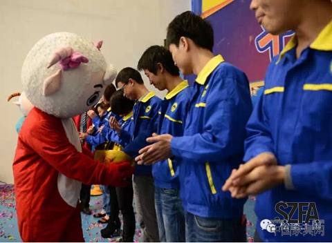 說到羊年,當然少不了羊的元素,待龍獅合歡一番表演后,憨態可掬的美羊羊攜手兩只喜羊羊手捧金元寶緩緩向舞臺走來,把裝有員工姓名的金元寶分別交付董事長郭總、制造中心李友忠副總經理及呂娟女士,郭總并從金元寶抽取幸運觀眾,把新年好彩頭送給員工,寓意員工是企業的財富,再次堅定了“成就員工”的永恒信念。