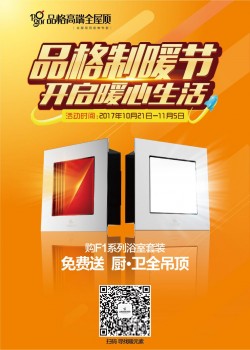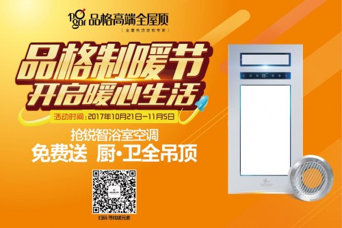 10月21日~11月5日品格制暖節(jié)火熱開啟,搶銳智浴室空調(diào)(銳智5.0) 送一廚一衛(wèi)全吊頂,F(xiàn)1系列浴室套裝,滿5980元送一廚一衛(wèi)全吊頂,還可疊加享受門店砸金蛋活動(dòng),100%中獎(jiǎng)!