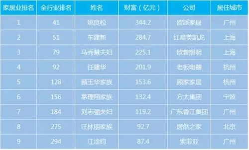 2017福布斯中國400富豪榜家居企業(yè)家排名隨著中國恒大集團(tuán)的股票飆升,許家印的財(cái)富凈值從去年的656.6億元猛增至2,813.5億元,躍居榜首。位居本榜單第2名的是馬化騰。馬化騰的財(cái)富猛增了近57%,達(dá)到2,581.8億元。電商巨頭阿里巴巴集團(tuán)董事局主席馬云位居第3位,財(cái)富凈值增長(zhǎng)了超過三分之一,達(dá)到2,555.3億元。在家居領(lǐng)域,今年的榜單也發(fā)生了明顯變化。去年排名福布斯榜第271名的歐派家居董事長(zhǎng)姚良松,今年飆升至第41名,財(cái)富凈值從去年的80.4億元猛增至344.2億元,名列家居行業(yè)第一。榜單顯示,家居行業(yè)中有9位大佬躋身福布斯中國400富豪榜。其中,歐派家居董事長(zhǎng)姚良松以344.2億元財(cái)富凈值位居家居圈榜首;紅星美凱龍車建新以284.7億元位列第二;歐普照明馬秀慧夫婦以225.1億元排名第三。