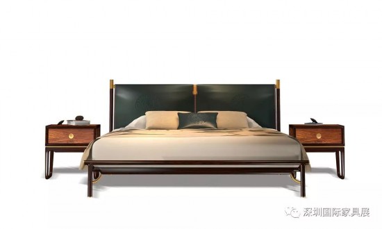 床型取方形結(jié)構(gòu),有初始之意,初始根本為‘元’,造型雖用線條取方形框架結(jié)構(gòu),但框架由圓柱形構(gòu)成,靠背及扶手突出的位置均為圓形面,圓即為點(diǎn)的集合,乃萬物運(yùn)動的本質(zhì),亦為乾坤之道,配以金屬裝飾,更是以小見大,突顯床體的高雅肅穆。