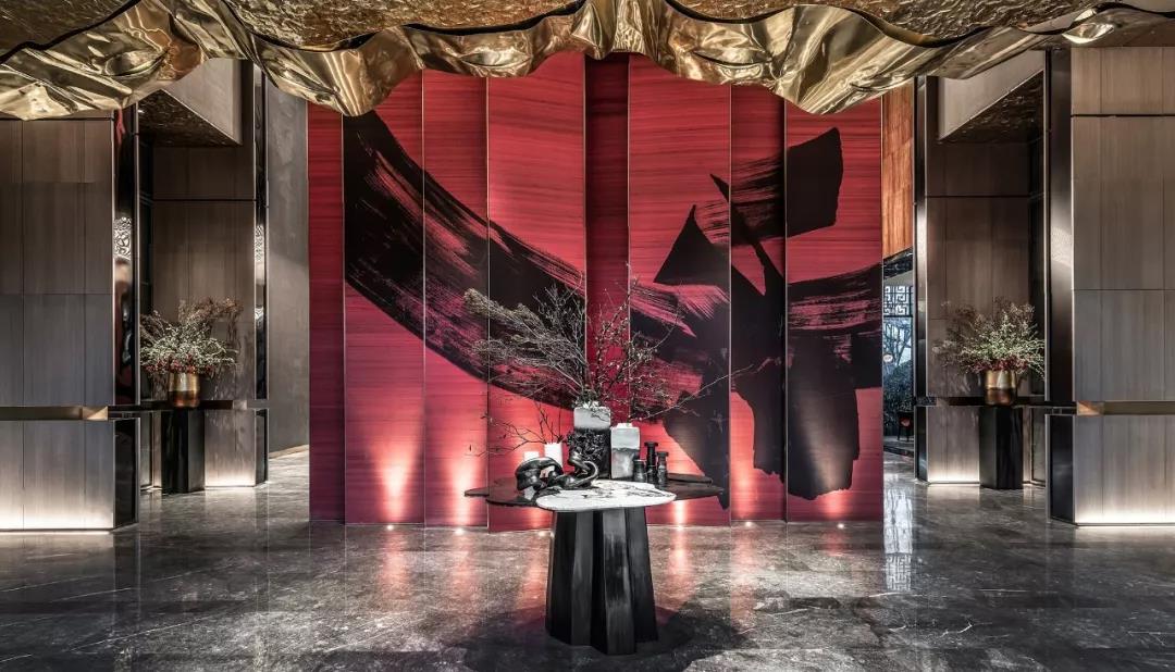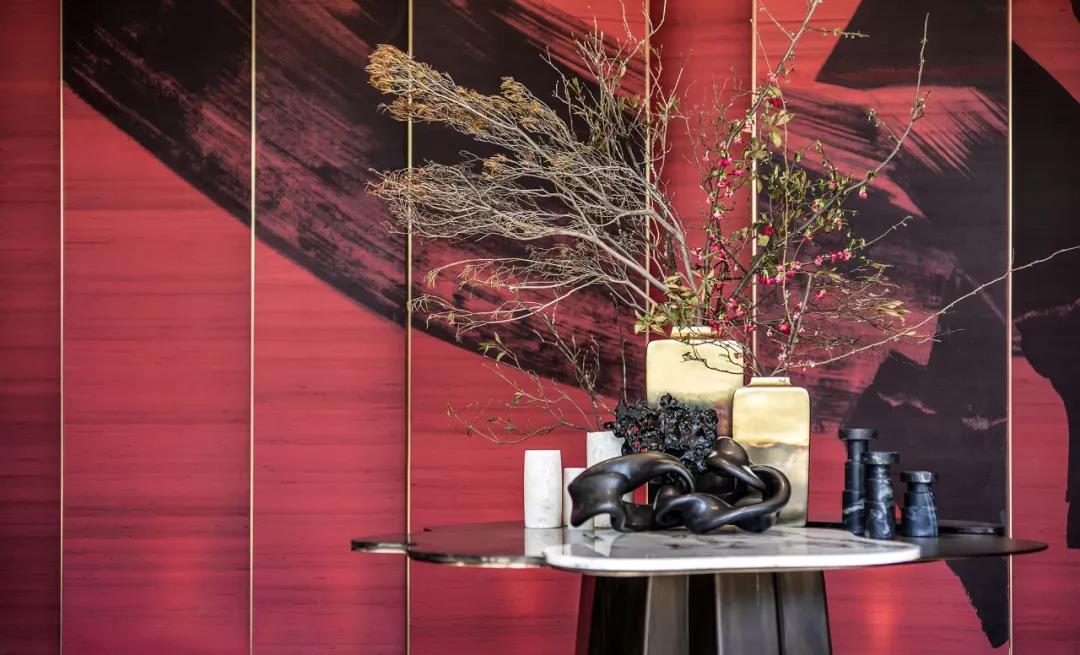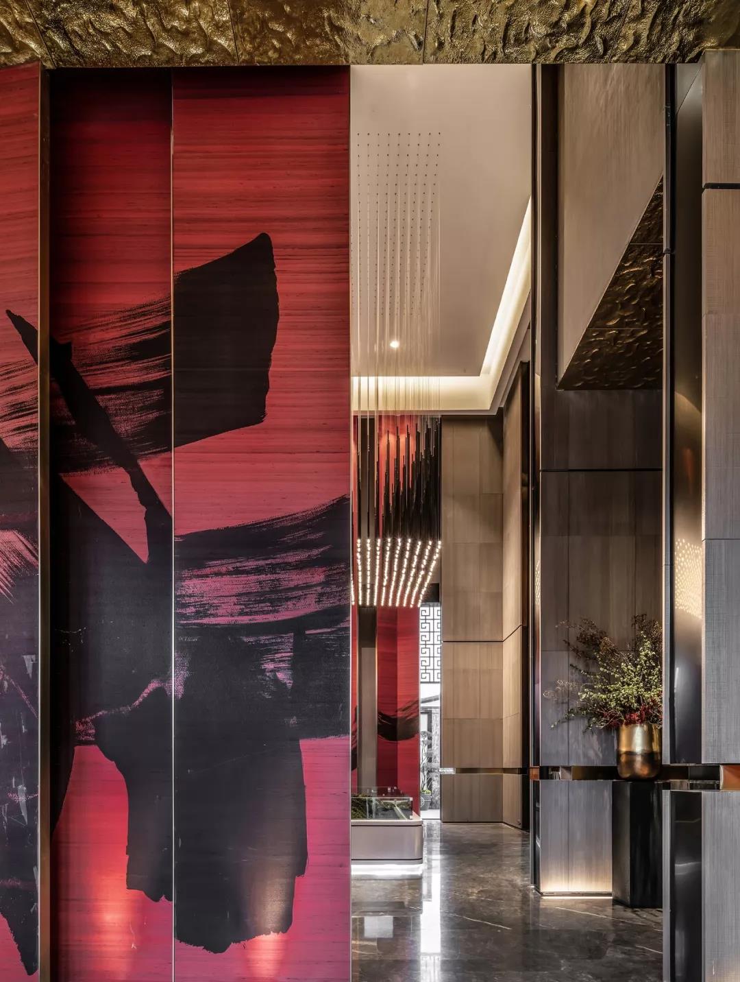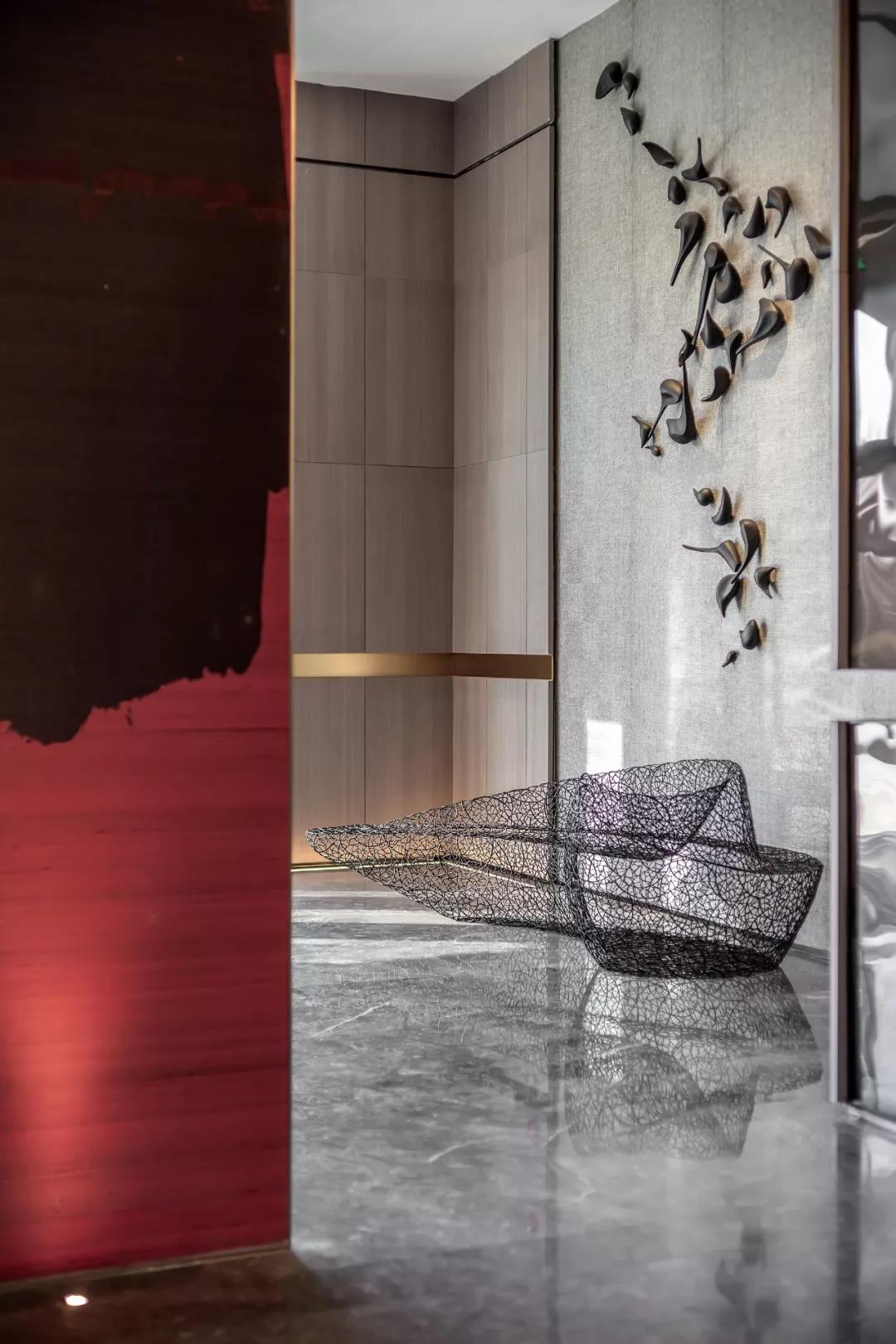 傳統觀感下的朱砂紅、墨黑與金色,和空間中使用的大理石、黃銅與木材堆疊穿斫,在悄無聲息中拉長了時空距離。錯落別開的屏風上濃重的一筆墨跡,凸顯灑脫東方藝術視像。一旁休息座椅的編織鏤空形制透著空氣感,抽象的鳥獸意象在墻面飛散開來,空間語言在生動的敘事性中產生不凡的震撼力。