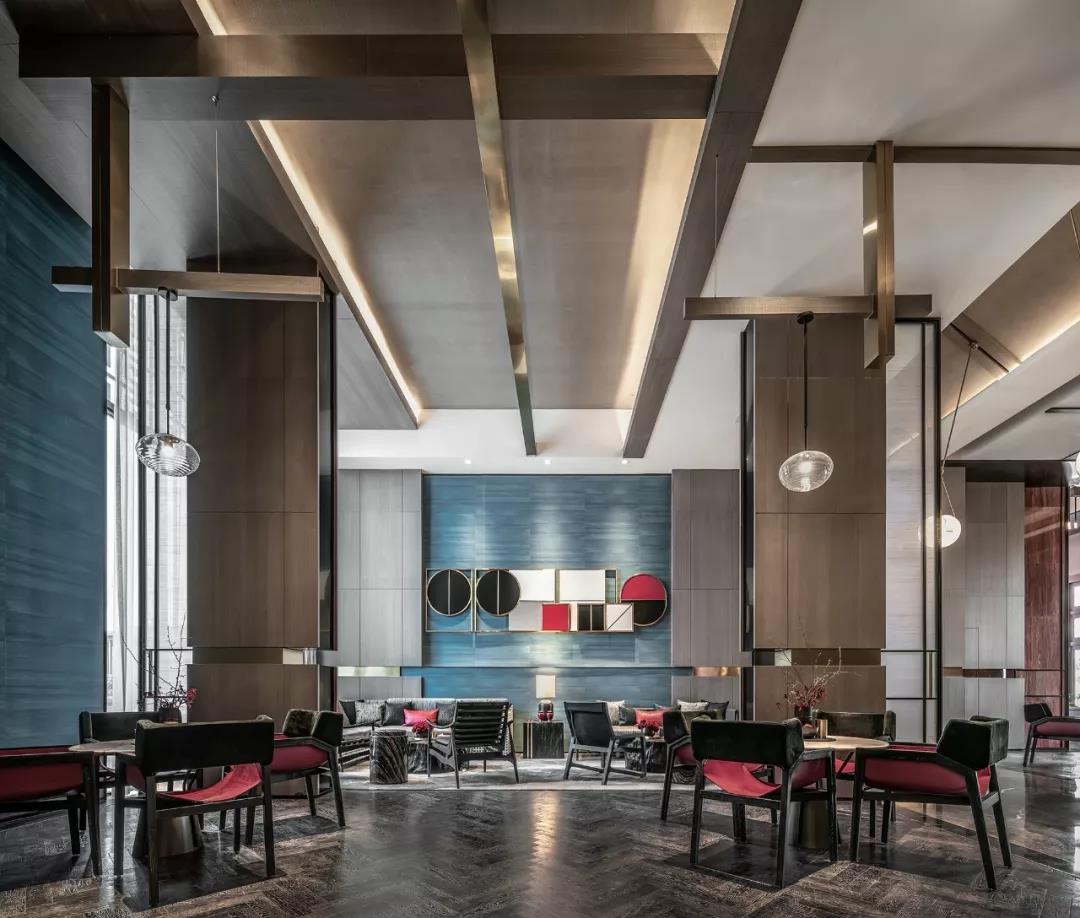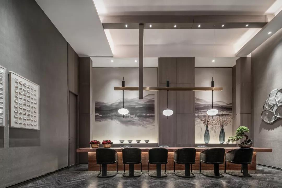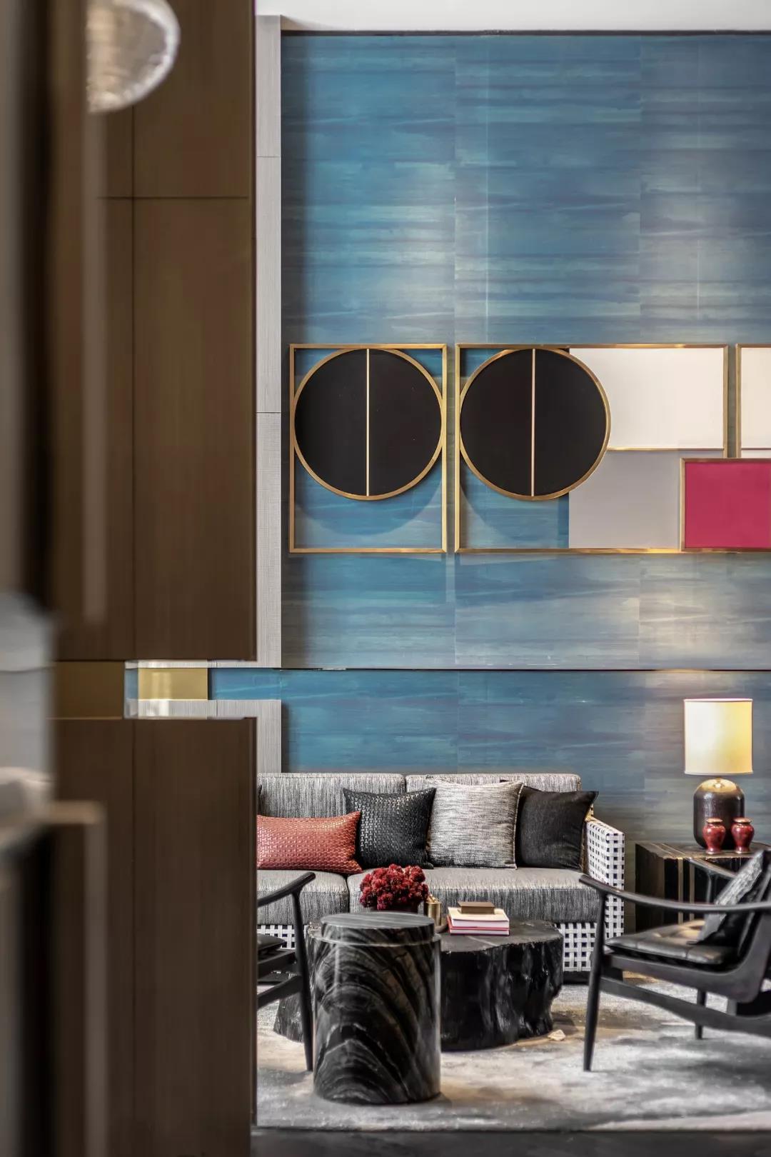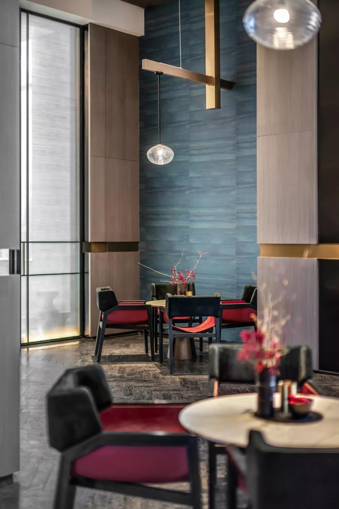 穿過朗闊的洽談區空間,是體量并不大的水吧區。墻畫中的山川倒影擔起空間純粹而寫意的美感,釉藍色的雅韻、家具造型的簡潔提供了當代東方的藝術張力,亦有著迷人的古韻,使得空間觀感愈顯深邃。