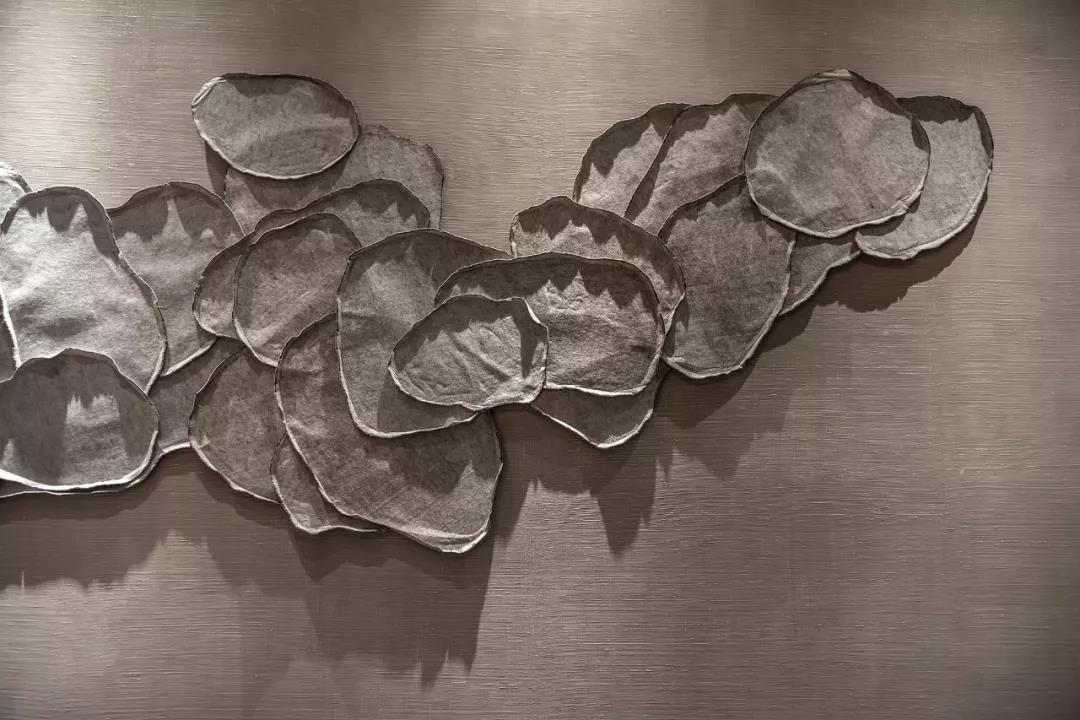 大幅畫作上疊山理水的自然氤氳氣息,營造出景深豐富、文雅詩意之感,煥發著中式的意美與深情??臻g內抽象或具體的元素,以端然的姿態、沉靜的形式語言一一指向更高遠的東方意識領域。