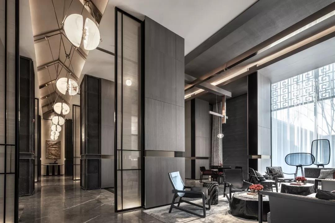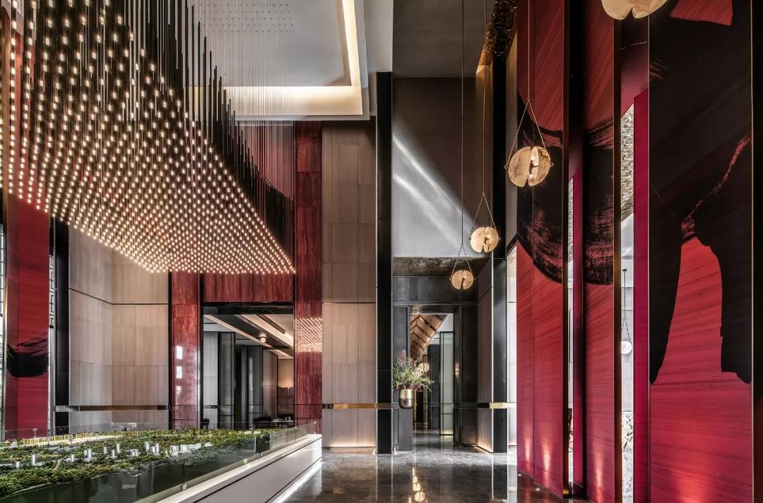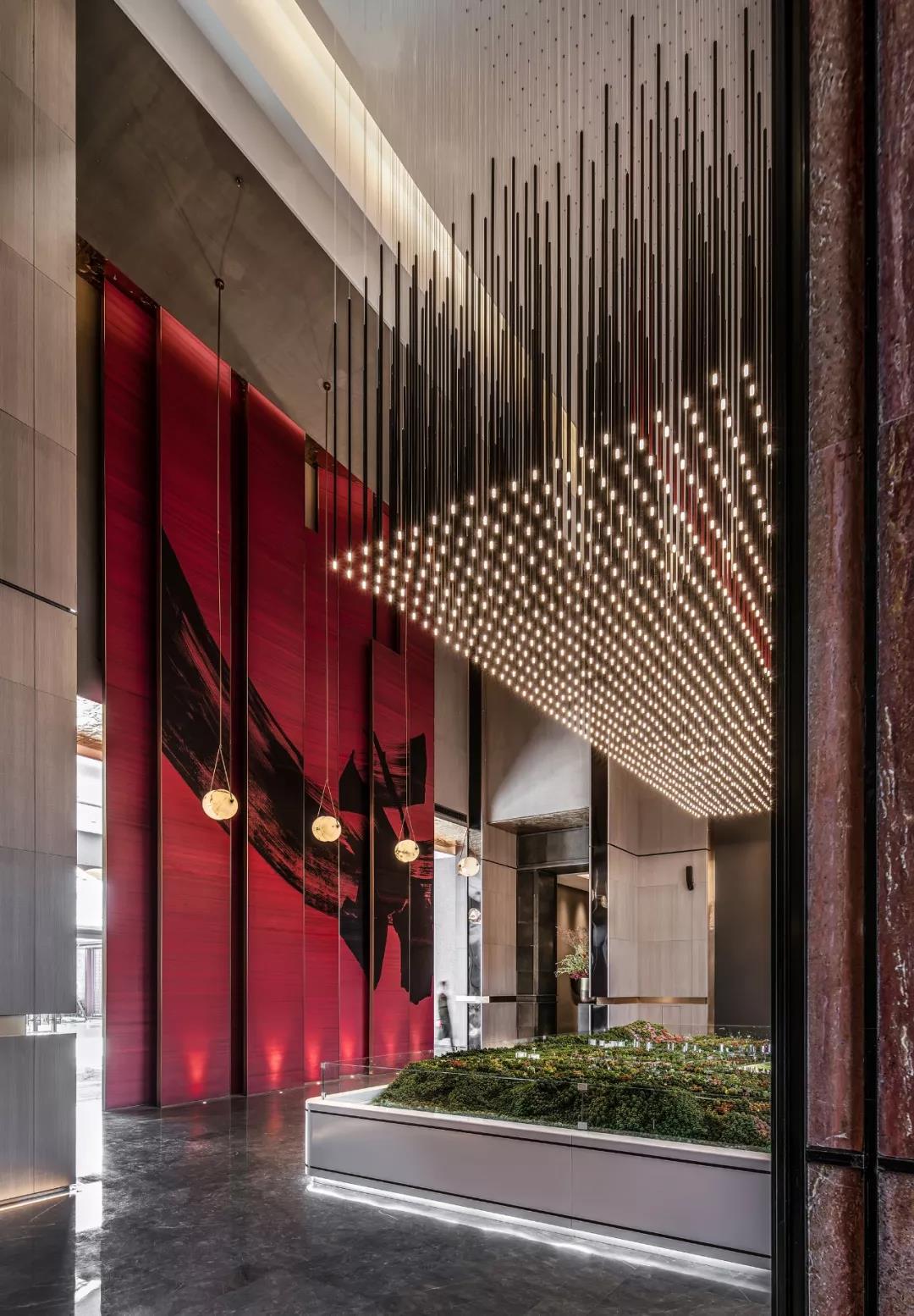 空間以中式對稱而宏大的陣列排布。巨型燈飾以不勝枚舉的吊燈組件構建起遼遠而闊大的觀感,東方蒼勁的書法筆跡游走于空間各處,當代與傳統融合共鳴,創造出一種包含著能量的“場域”,演繹空間的靈動美與超驗感。
