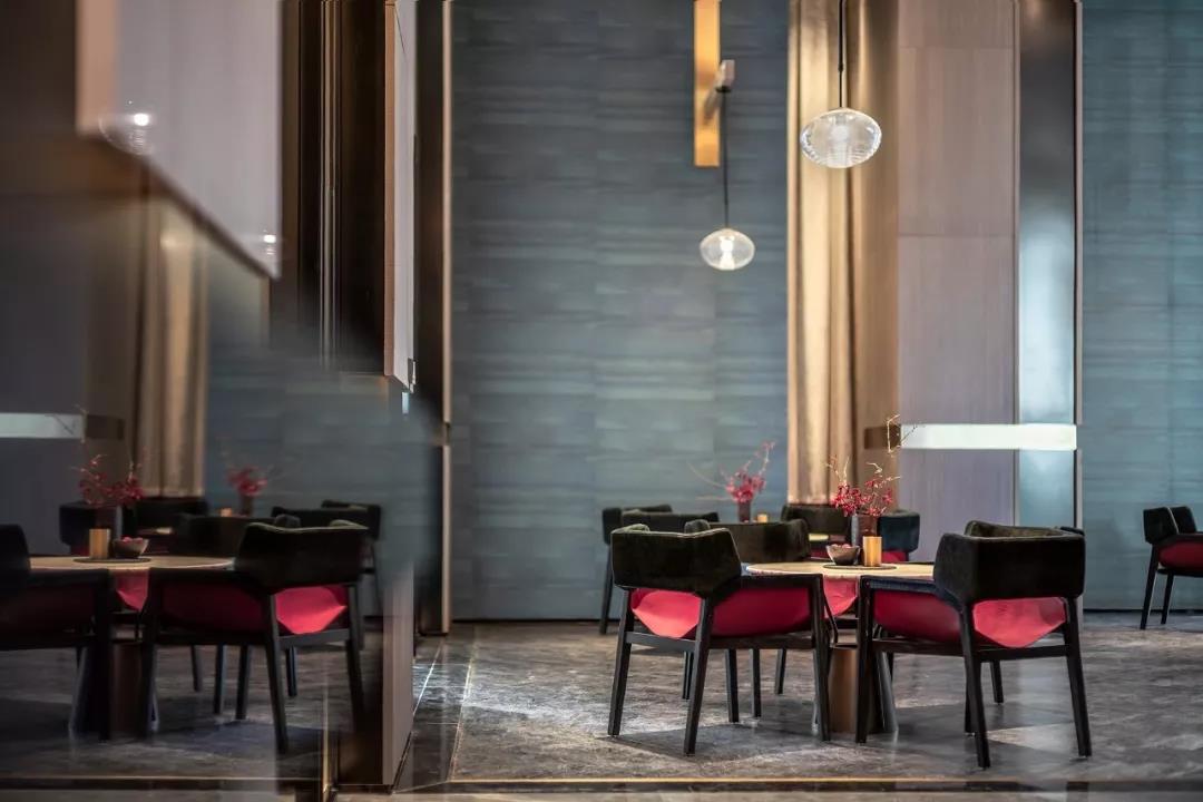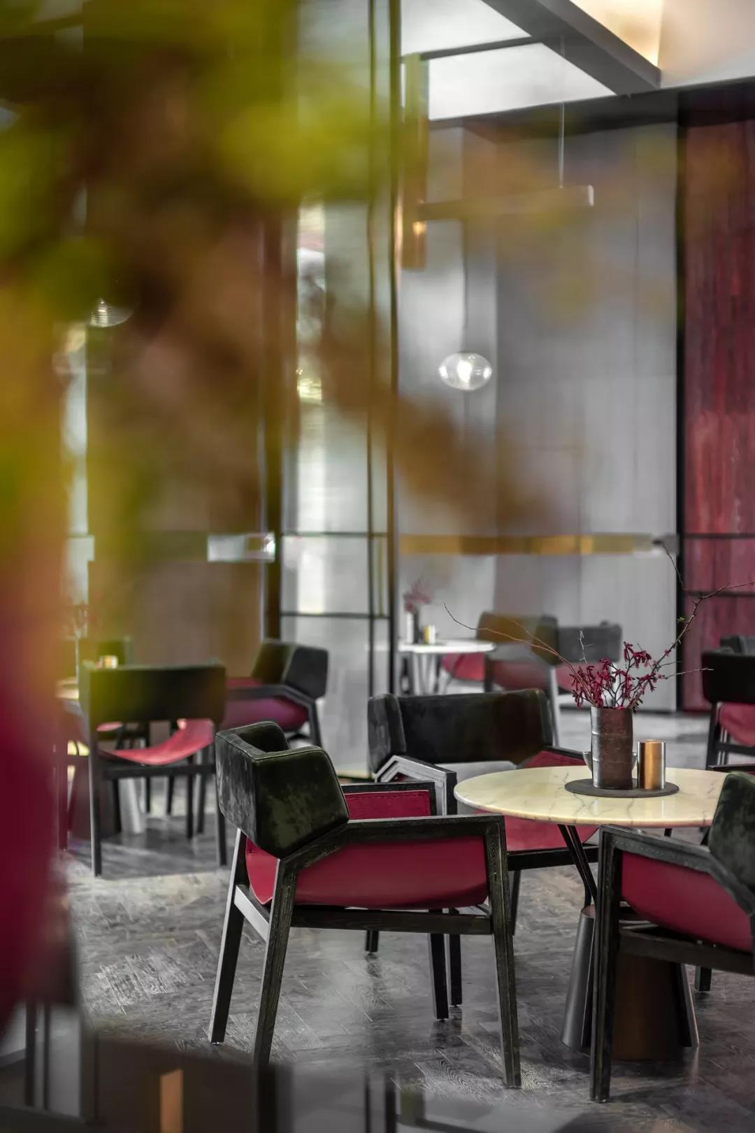 天花設計特意架構起數株檐梁,梁上垂墜而下的燈盞似云石或琉璃般清透雅澹,黑色與朱砂紅配搭的反絨皮面單椅以圍合式組合,數枝干花有著濃烈的神韻,空間的軟裝部品映射著中式建筑內飾的藝術視像,典雅不乏精尚。