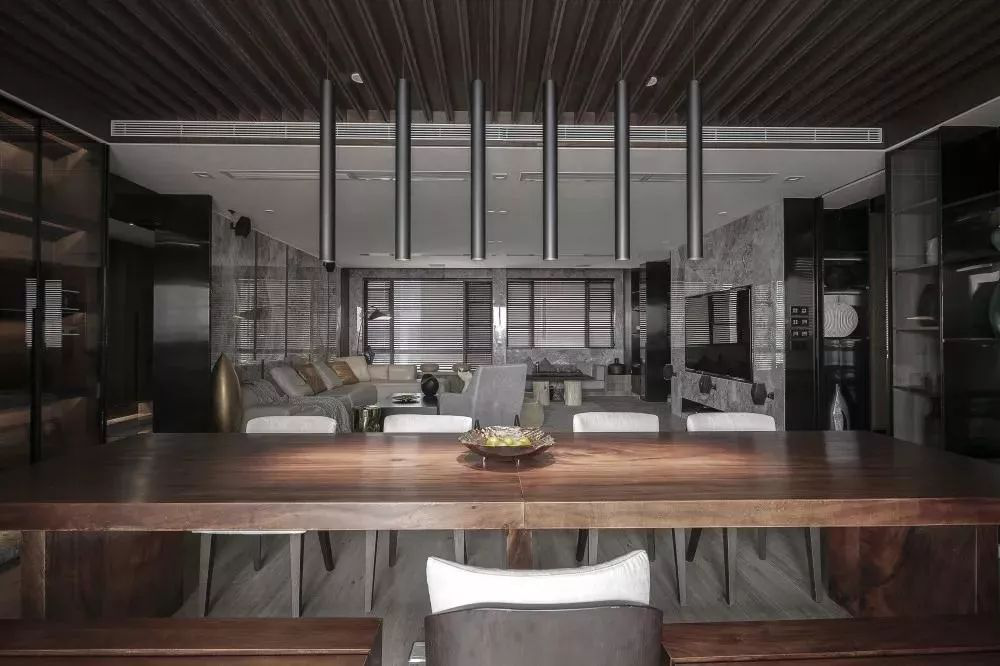 這個項目是在華僑城的香山美墅,這套房子是一個復式空間,男主人原本是做平面廣告創意相關工作的,對產品這一塊很敏銳,女主人是客家人,傳統文化意識比較重,他們都想要中式風格。家里有兩個孩子,大的7歲,小的3歲,都是男孩,家里還有兩位老人,但是媽媽腳有風濕,腿腳不是很好,所以當時跟她溝通希望有中式風格,但是盡量結合他們的功能需求。業主不希望太過于浮夸,但是希望有設計亮點、設計細節。