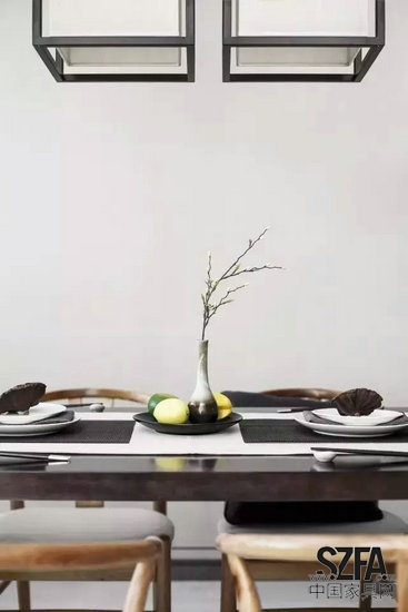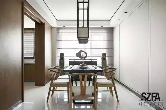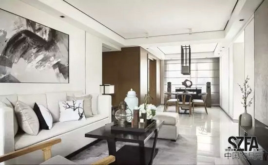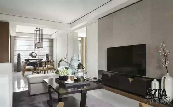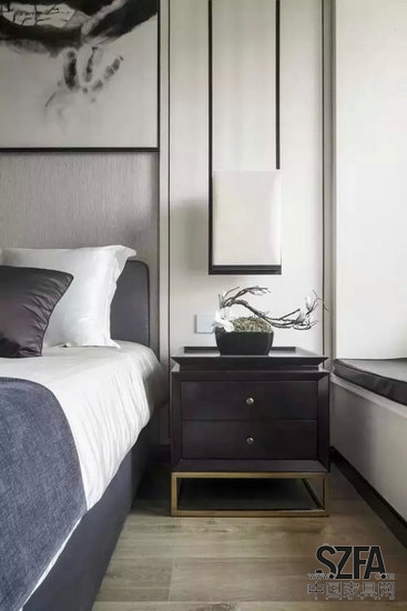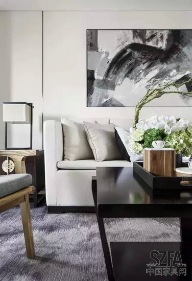 從入口處一面墻的寫意水墨淡淡的從遠處慢慢滲入,于是,會客廳沙發背景、走道盡頭端景、主臥床頭背景以及案幾上無意擺放的,都是或多或少、或重或輕的寫意水墨,行云流水,一氣呵成。