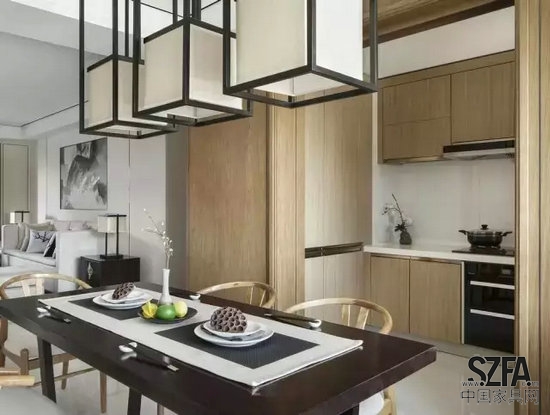 整個材質關系和色彩變化上是平緩過渡而舒暢的,大面積留白墻面,局部墻面處理成金絲楠整塊木飾面銜接廚房內部用材,會客區電視墻面小塊面壓深是為了節奏的變化及功能的需要,就像呼吸均勻而平緩的兩個人席地而坐,對弈。