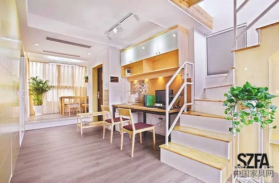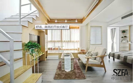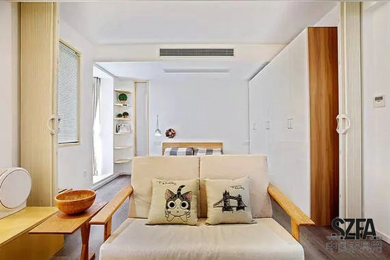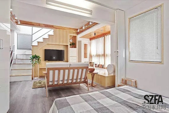 小戶型雙人沙發(fā)背后,便是開放式臥室,當(dāng)折疊門打開時(shí),主人可以很方便地在床上觀看影片。來客時(shí),折疊門一關(guān),臥室風(fēng)光自然遮掩不可見了。