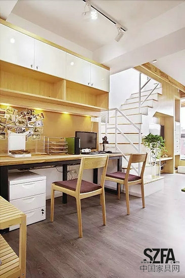 書房無隔斷,緊靠樓梯而設(shè),墻上的書柜提供充足的儲(chǔ)藏空間,溫馨的木色配上隱藏式小射燈,即使是在夜深人靜的時(shí)候也有一份舒適祥和的讀書氛圍。