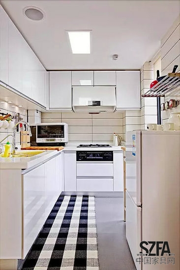 廚房雖小,卻擁有一扇不小的窗戶,良好的采光讓廚房變得明亮。L型櫥柜特意挑選白色烤瓷面板,反射性較強(qiáng),提升空間的明亮度。