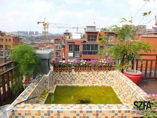 花園里用馬賽克鋪設(shè)出一個(gè)小水池,養(yǎng)些金魚可以陶冶情操