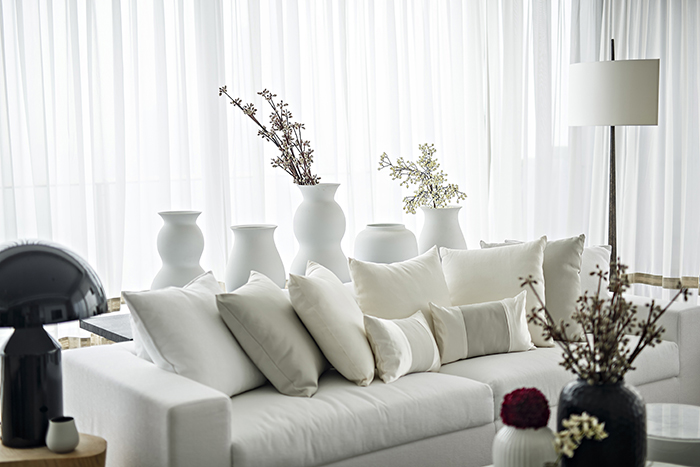 The neutral tones that can be seen throughout these stunning apartments are harmoniously highlighted with dashes of red, dusty pink, ochre, orange, black and rose gold, which add to the charming warmth and sumptuous opulence that marks all of Kelly Hoppen's designs.