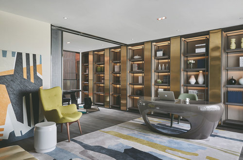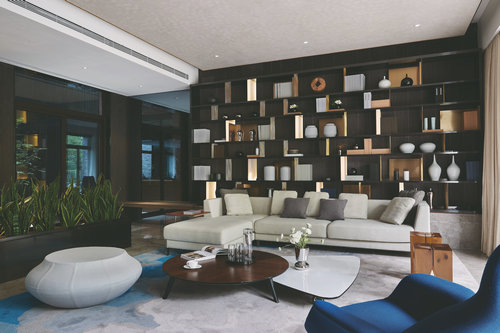 地下一層家庭室,綠植將整個空間動線劃分為通道及活動區(qū)。藍(lán)色家私及古銅質(zhì)感書架相映成趣,彼此穿透,給空間賦予雅致、輕松的色彩。活動區(qū)書架采用金屬沖孔板和發(fā)光體,清晰明快的線條增添整體視覺沖擊力。