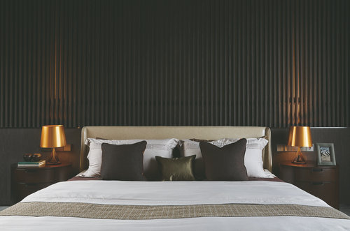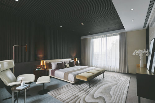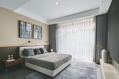 主臥立面及吊頂?shù)陌偃~元素與客廳餐廳立面和諧統(tǒng)一。水墨紋路地毯與自然光線融合,產(chǎn)生極富韻律的光影效果,令空間低調(diào)、怡心。在賦予空間沉穩(wěn)大氣的同時,現(xiàn)代人追求的舒適靜謐也在這里得到滿足。